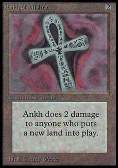 | Nome em Inglês: | Ankh of Mishra | | Nome em Português: | Sem nome em Português | | Custo de Mana: |  | | Tipo: | Artefato | | Texto: | Toda vez que um terreno entrar no Campo de Batalha, Ankh of Mishra causa 2 pontos de dano ao controlador daquele terreno. | | Série: |  | | Outras: | | | Raridade: | Raro | | Card: | 231 |