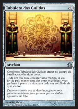 | Nome em Inglês: | Tablet of the Guilds | | Nome em Português: | Tabuleta das Guildas | | Custo de Mana: |  | | Tipo: | Artefato | | Texto: | Conforme Tablet of the Guilds entrar no Campo de Batalha, escolha duas cores. Toda vez que você Conjurar uma mágica, se aquela mágica for de ao menos uma das cores escolhidas, Você ganha 1 ponto de vida para cada uma das cores escolhidas da qual aquela mágica for. | | Série: |  | | Raridade: | Incomum | | Card: | 235 |