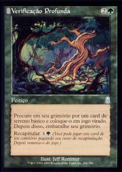 | Nome em Inglês: | Deep Reconnaissance | | Nome em Português: | Verificação Profunda | | Custo de Mana: |   | | Tipo: | Feitiço | | Texto: | Procure em seu grimório por um card de terreno básico e coloque aquele card no Campo de Batalha virado. Embaralhe seu grimório a seguir. Recapitular  . | | Série: |  | | Raridade: | Incomum | | Card: | 236 |