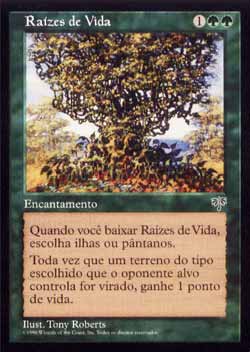 | Nome em Inglês: | Roots of Life | | Nome em Português: | Raízes de Vida | | Custo de Mana: |    | | Tipo: | Encantamento | | Texto: | Conforme Roots of Life entra no Campo de Batalha, escolha Ilha ou Pântano. Toda vez que um terreno do tipo escolhido controlado por um oponente for virado, você ganha 1 ponto de vida. | | Série: |  | | Raridade: | Incomum | | Card: | 237 |