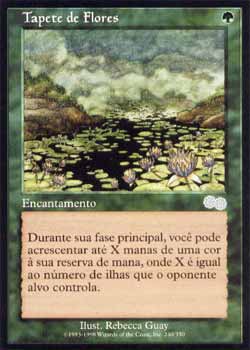 | Nome em Inglês: | Carpet of Flowers | | Nome em Português: | Tapete de Flores | | Custo de Mana: |  | | Tipo: | Encantamento | | Texto: | No início de sua Primeira Fase Principal, você pode adicionar até X manas de uma única cor qualquer a sua reserva de mana, onde X é o número de Ilhas que o oponente alvo controla. | | Série: |  | | Raridade: | Incomum | | Card: | 240 |