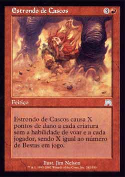 | Nome em Inglês: | Thunder of Hooves | | Nome em Português: | Estrondo de Cascos | | Custo de Mana: |   | | Tipo: | Feitiço | | Texto: | Thunder of Hooves causa X pontos de dano a cada criatura sem Voar e a cada jogador, onde X é o número de Bestas no Campo de Batalha. | | Série: |  | | Raridade: | Incomum | | Card: | 242 |