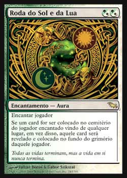 | Nome em Inglês: | Wheel of Sun and Moon | | Nome em Português: | Roda do Sol e da Lua | | Custo de Mana: |   | | Tipo: | Encantamento - Aura | | Texto: | Encantar jogador. Toda vez que um card seria colocado no cemitério do jogador encantado vindo de qualquer lugar, aquele card é revelado e colocado no fundo do grimório daquele jogador ao invés. | | Série: |  | | Raridade: | Raro | | Card: | 243 |