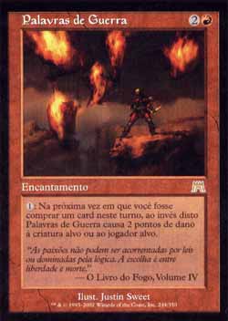 | Nome em Inglês: | Words of War | | Nome em Português: | Palavras de Guerra | | Custo de Mana: |   | | Tipo: | Encantamento | | Texto: | : A próxima vez que você fosse comprar um card durante este turno, Words of War causa 2 pontos de dano à criatura ou ao jogador alvo ao invés. | | Série: |  | | Raridade: | Raro | | Card: | 244 |