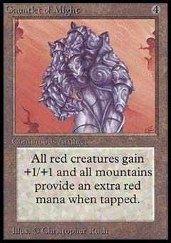 | Nome em Inglês: | Gauntlet of Might | | Nome em Português: | Sem nome em Português | | Custo de Mana: |  | | Tipo: | Artefato | | Texto: | As criaturas vermelhas ganham +1/+1. Toda vez que uma Montanha for virada para adicionar mana, o controlador daquela Montanha adiciona um adicional a sua própria reserva de mana. | | Série: |  | | Raridade: | Raro | | Card: | 245 |