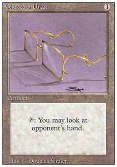 | Nome em Inglês: | Glasses of Urza | | Nome em Português: | Sem nome em Português | | Custo de Mana: |  | | Tipo: | Artefato | | Texto: | : Olhe a mão do jogador alvo. | | Série: |  | | Outras: | | | Raridade: | Incomum | | Card: | 249 |