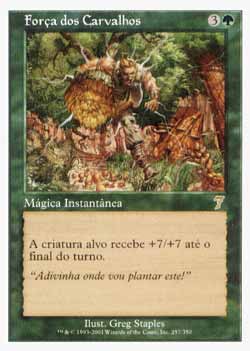 | Nome em Inglês: | Might of Oaks | | Nome em Português: | Força dos Carvalhos | | Custo de Mana: |   | | Tipo: | Mágica Instantânea | | Texto: | A criatura alvo ganha +7/+7 até o final do turno. | | Série: |  | | Outras: | | | Raridade: | Raro | | Card: | 257 |