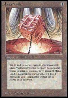 | Nome em Inglês: | Mana Vault | | Nome em Português: | Sem nome em Português | | Custo de Mana: |  | | Tipo: | Artefato | | Texto: | Mana Vault não desvira durante sua Etapa de Desvirar. No início de sua Etapa de Manutenção, você pode pagar . Se o fizer, desvire Mana Vault. No início de sua Etapa de Compra, se Mana Vault estiver virado, Mana Vault causa 1 ponto de dano a você.