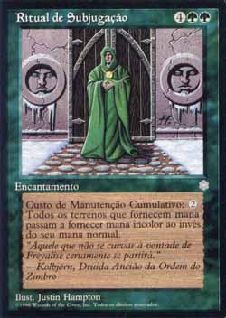 | Nome em Inglês: | Ritual of Subdual | | Nome em Português: | Ritual de Subjugação | | Custo de Mana: |    | | Tipo: | Encantamento | | Texto: | Manutenção Cumulativa . Se forem virados para adicionar mana, os terrenos produzem mana incolor ao invés de qualquer outro tipo de mana. | | Série: |  | | Raridade: | Raro | | Card: | 261 |