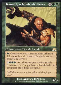| Nome em Inglês: | Kamahl, Fist of Krosa | | Nome em Português: | Kamahl, o Punho de Krosa | | Custo de Mana: |    | | Tipo: | Criatura Lendária - Humano Druida | | Texto: | : O terreno alvo torna-se uma criatura 1/1 até o final do turno. Aquela criatura continua sendo um terreno.