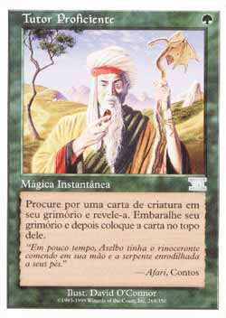 | Nome em Inglês: | Worldly Tutor | | Nome em Português: | Tutor Proficiente | | Custo de Mana: |  | | Tipo: | Mágica Instantânea | | Texto: | Procure em seu grimório por um card de criatura e revele-o. Embaralhe seu grimório e então coloque o card revelado em seu topo. | | Série: |  | | Outras: | | | Raridade: | Incomum | | Card: | 269 |