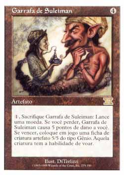 | Nome em Inglês: | Bottle of Suleiman | | Nome em Português: | Garrafa de Suleiman | | Custo de Mana: |  | | Tipo: | Artefato | | Texto: | , sacrifique Bottle of Suleiman: Lance uma moeda. Se você perder, Bottle of Suleiman causa 5 pontos de dano a você. Se você vencer, coloque no Campo de Batalha uma ficha de criatura artefato incolor 5/5 do tipo Gênio com Voar. | | Série: |  | | Outras: | | | Raridade: | Raro | | Card: | 275 |