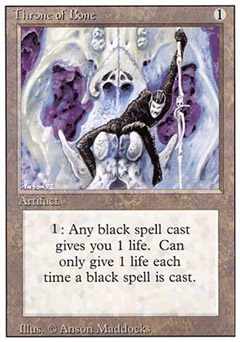 | Nome em Inglês: | Throne of Bone | | Nome em Português: | Sem nome em Português | | Custo de Mana: |  | | Tipo: | Artefato | | Texto: | Toda vez que um jogador Conjurar uma mágica preta, você pode pagar . Se o fizer, você ganha 1 ponto de vida. | | Série: |  | | Outras: | | | Raridade: | Incomum | | Card: | 279 |