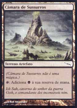 | Nome em Inglês: | Vault of Whispers | | Nome em Português: | Câmara de Sussurros | | Tipo: | Terreno Artefato | | Texto: | : Adiciona a sua reserva de mana. | | Série: |  | | Outras: | | | Raridade: | Comum | | Card: | 286 |