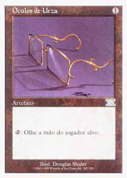| Nome em Inglês: | Glasses of Urza | | Nome em Português: | Óculos de Urza | | Custo de Mana: |  | | Tipo: | Artefato | | Texto: | : Olhe a mão do jogador alvo. | | Série: |  | | Outras: | | | Raridade: | Incomum | | Card: | 287 |