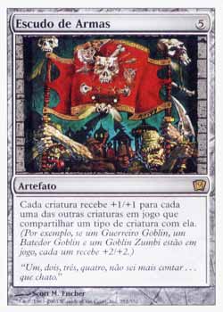 | Nome em Inglês: | Coat of Arms | | Nome em Português: | Escudo de Armas | | Custo de Mana: |  | | Tipo: | Artefato | | Texto: | Cada criatura ganha +1/+1 para cada outra criatura no Campo de Batalha que compartilhe um tipo de criatura com aquela criatura. | | Série: |  | | Outras: | | | Raridade: | Raro | | Card: | 291 |