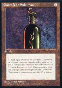 | Nome em Inglês: | Bottle of Suleiman | | Nome em Português: | Garrafa de Suleiman | | Custo de Mana: |  | | Tipo: | Artefato | | Texto: | , sacrifique Bottle of Suleiman: Lance uma moeda. Se você perder, Bottle of Suleiman causa 5 pontos de dano a você. Se você vencer, coloque no Campo de Batalha uma ficha de criatura artefato incolor 5/5 do tipo Gênio com Voar. | | Série: |  | | Outras: | | | Raridade: | Raro | | Card: | 301 |