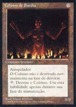 | Nome em Inglês: | Colossus of Sardia | | Nome em Português: | Colosso de Sardia | | Custo de Mana: |  | | Tipo: | Criatura Artefato - Golem | | Texto: | Atropelar. Colossus of Sardia não desvira durante sua Etapa de Desvirar.