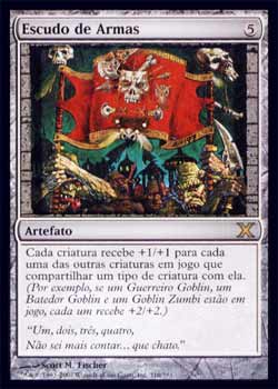 | Nome em Inglês: | Coat of Arms | | Nome em Português: | Escudo de Armas | | Custo de Mana: |  | | Tipo: | Artefato | | Texto: | Cada criatura ganha +1/+1 para cada outra criatura no Campo de Batalha que compartilhe um tipo de criatura com aquela criatura. | | Série: |  | | Outras: | | | Raridade: | Raro | | Card: | 316 |