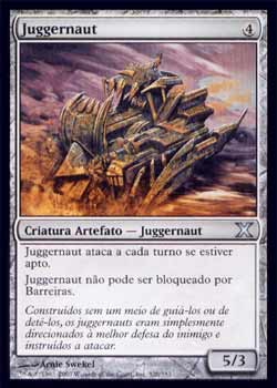 | Nome em Inglês: | Juggernaut | | Nome em Português: | Juggernaut | | Custo de Mana: |  | | Tipo: | Criatura Artefato - Juggernaut | | Texto: | Juggernaut ataca a cada turno se estiver apto. Juggernaut não pode ser bloqueado por Barreiras. | | P/T: | 5/3 | | Série: |  | | Outras: | | | Raridade: | Incomum | | Card: | 328 |