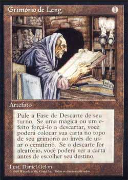 | Nome em Inglês: | Library of Leng | | Nome em Português: | Grimório de Leng | | Custo de Mana: |  | | Tipo: | Artefato | | Texto: | Você não tem um número máximo de cards para sua mão. Se um efeito fizer com que você descarte um card, você pode colocar o card descartado no topo de seu grimório ao invés de em seu cemitério. | | Série: |  | | Outras: | | | Raridade: | Incomum | | Card: | 333 |