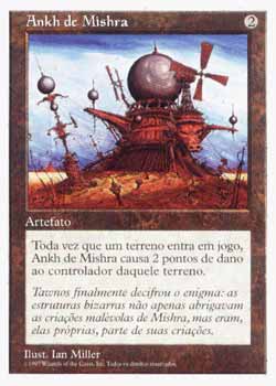| Nome em Inglês: | Ankh of Mishra | | Nome em Português: | Ankh de Mishra | | Custo de Mana: |  | | Tipo: | Artefato | | Texto: | Toda vez que um terreno entrar no Campo de Batalha, Ankh of Mishra causa 2 pontos de dano ao controlador daquele terreno. | | Série: |  | | Outras: | | | Raridade: | Raro | | Card: | 348 |