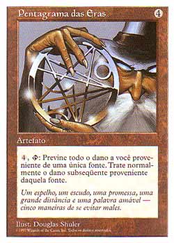 | Nome em Inglês: | Pentagram of the Ages | | Nome em Português: | Pentagrama das Eras | | Custo de Mana: |  | | Tipo: | Artefato | | Texto: | , : Na próxima vez que uma fonte a sua escolha fosse causar dano a você durante este turno, previne aquele dano. | | Série: |  | | Outras: | | | Raridade: | Raro | | Card: | 394 |
