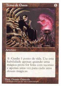 | Nome em Inglês: | Throne of Bone | | Nome em Português: | Trono de Ossos | | Custo de Mana: |  | | Tipo: | Artefato | | Texto: | Toda vez que um jogador Conjurar uma mágica preta, você pode pagar . Se o fizer, você ganha 1 ponto de vida. | | Série: |  | | Outras: | | | Raridade: | Incomum | | Card: | 403 |