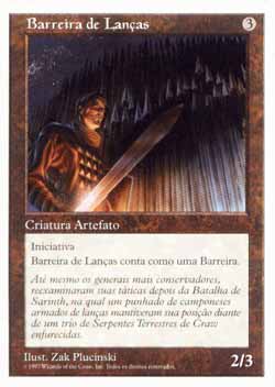 | Nome em Inglês: | Wall of Spears | | Nome em Português: | Barreira de Lanças | | Custo de Mana: |  | | Tipo: | Criatura Artefato - Barreira | | Texto: | Defensor, Iniciativa. | | P/T: | 2/3 | | Série: |  | | Outras: | | | Raridade: | Comum | | Card: | 407 |